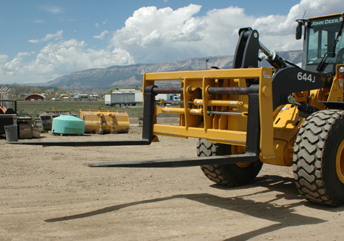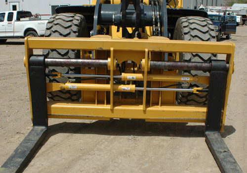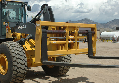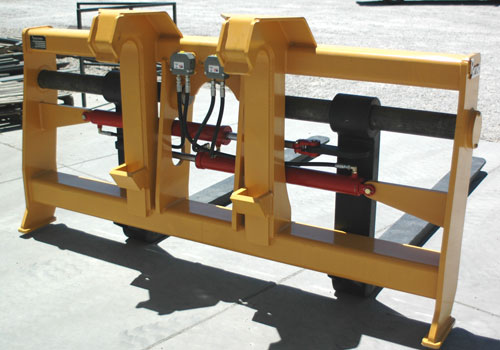 They are used to handle different types of pipe, lumber, logs, hay bales, palletized materials and many other applications. Visibility is excellent through the fork carriage from the operator’s seat to the load being handled. The hydraulic adjusting cylinders are direct acting and operate using the loader’s hydraulic third function valve. Heavy duty tine locks are standard to lock the tines back against the carriage. OEM Pin-on Mounts, Rylind Wedge-loc Coupler, Pin-loc Coupler, JRB, Volvo, Deere, CAT, ACS, and other coupler systems are available for all fork carriages.
