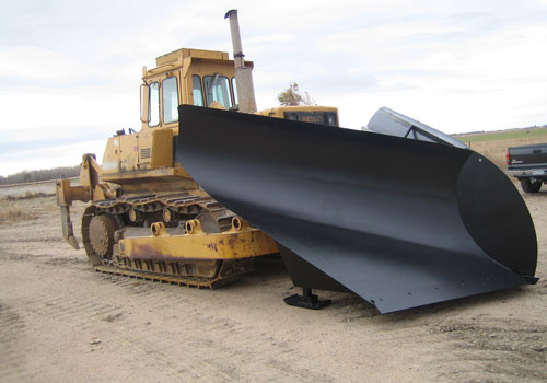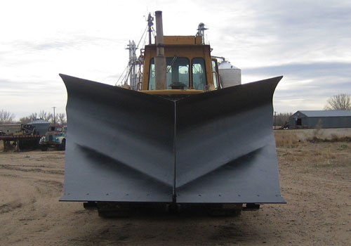 This is a custom designed V-Plow that mounts to the front arm pin on this Dozer for easy removal.